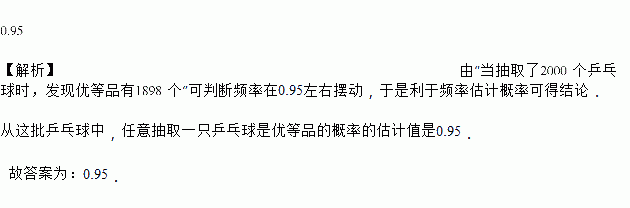 在进行某批乒乓球的质量检验时,当抽取了个乒乓球时,发现优等品有个,则这批乒乓球“优等品”的概率的估计值是_________(精确到).