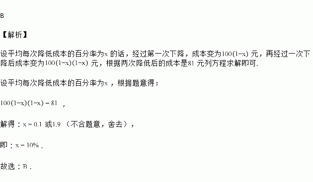 制造一种产品,原来每件的成本是100元,由于连续两次降低成本,现在的成本是81元,则平均每次降低成本的百分率为( )