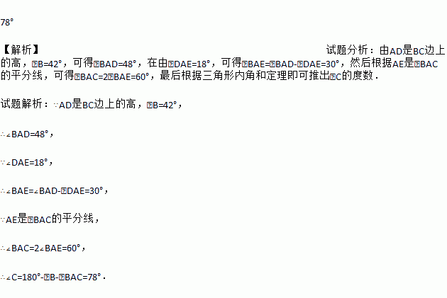 如图,在△ABC中,AD是BC边上的高,AE是∠BAC的平分线,∠B=42°,∠DAE=18°,求∠C的度数.