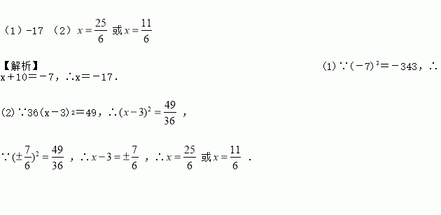 (1)-17 (2)或 【解析】(1)∵(-7)3=-343,∴x+10=-7,∴x=-17. (2)∵36(x-3)2=49,∴, ∵,∴,∴或.