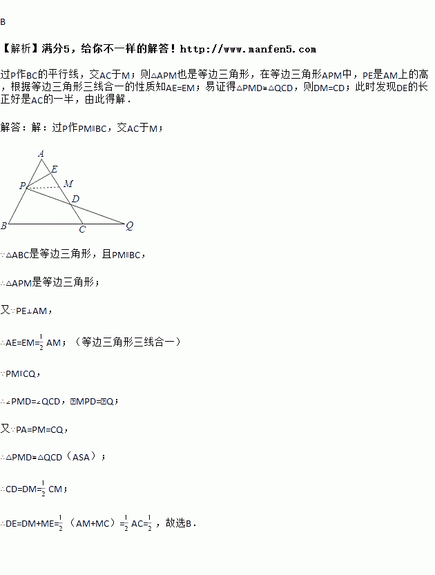 如图,过边长为1的等边△ABC的边AB上一点P,作PE⊥AC于E,Q为BC延长线上一点,当PA=CQ时,连PQ交AC边于D,则DE的长为( )