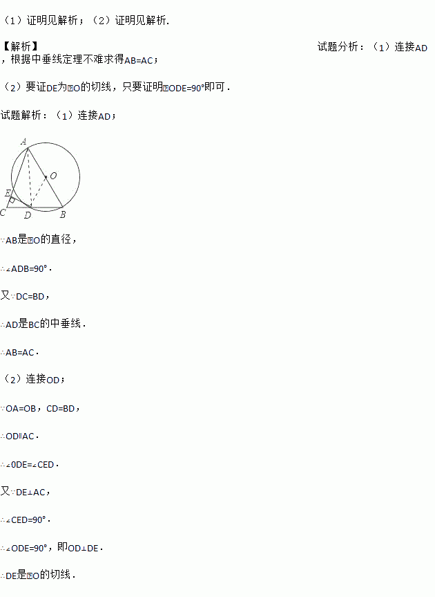 如图所示,AB是⊙O的直径,BD是⊙O的弦,延长BD到点C,使DC=BD,连接AC,过点D作DE⊥AC于E.