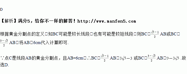 点C是线段AB的黄金分割点,且AB=6cm,则BC的长为( )cm