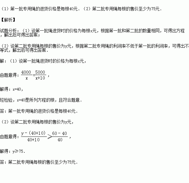 (2)若第一批专用绳的售价是每根60元,为保证第二批专用绳的利润率不低于第一批的利润率,那么第二批专用绳每根售价至少是多少元?