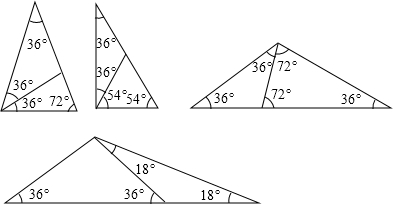 分析:符合条件的形状不同的△ABC有4个,分别是:顶角为36°的等腰三角形、底角为36°的等腰三角形、有一锐角等于36°的直角三角形、各角为36°、18°、126°的钝角三角形.