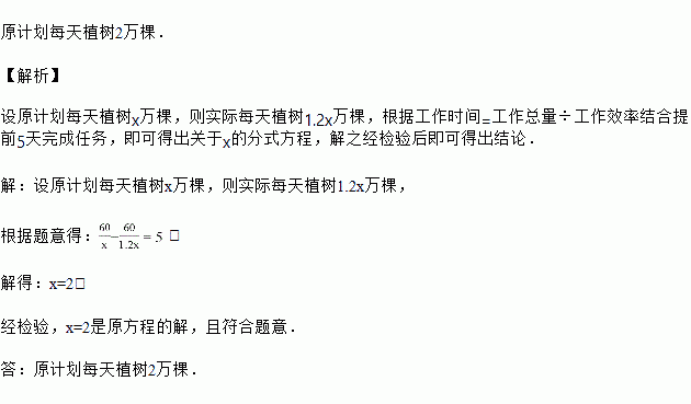 在创建文明城市的进程中,我市为美化城市环境,计划种值树木60万棵,由于志愿者的加入,实际每天植树比原计划多20%,结果提前5天完成任务,求原计划每天植树多少万棵?