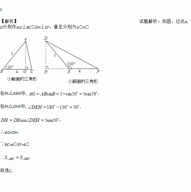 数学活动课上,小敏、小颖分别画了△ABC和△DEF,数据如图,如果把小敏画的三角形面积记作S△ABC,小颖画的三角形面积记作S△DEF,那么你认为( )