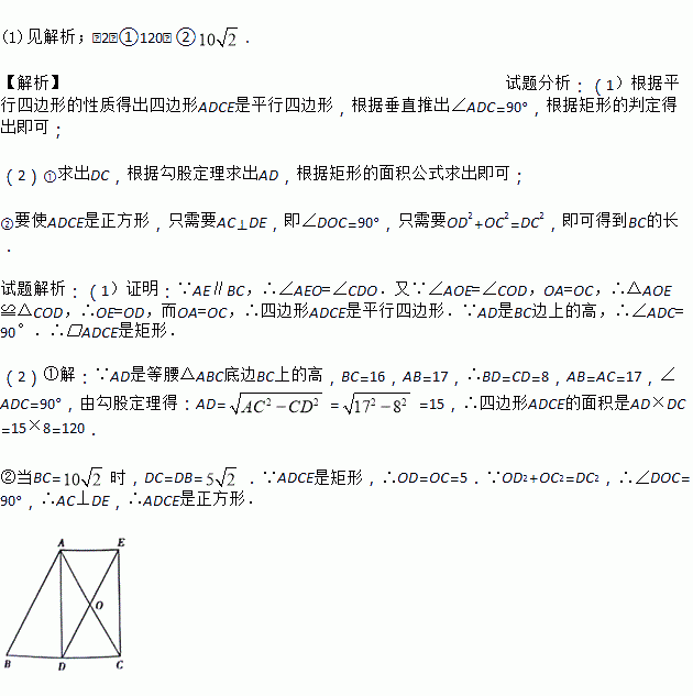 ②若AB=10,则BC= 时,四边形ADCE是正方形。