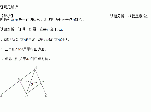 如图,在中,D为BC上任一点, 交AB于点交AC于点F,求证:点关于AD的中点对称.
