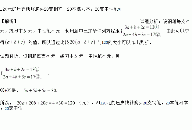 小红在学校商店买了3支钢笔,1本练习本,2支中性笔共花13元,小颖买了2支钢笔,4本练习本,3支中性笔共花17元,小明打算在该商店买20支钢笔,20本练习本,20支中性笔寄给四川地震灾区的小朋友,他只有120元的压岁钱,请你帮他算一下,他的钱够吗?