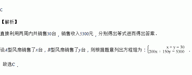 两种型号的风扇,两周内共销售30台,销售收入5300元,![]()