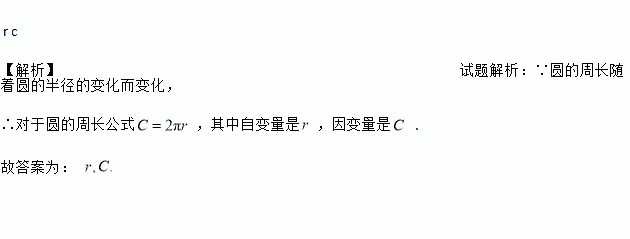 r c 【解析】试题解析:∵圆的周长随着圆的半径的变化而变化, ∴对于圆的周长公式,其中自变量是,因变量是 . 故答案为: