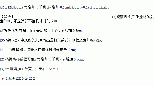 已知某弹簧长度的最大挂重为 25 千克,在弹性限度内,用 x 表示的物体的质量,用 y表示弹簧的长度,其关系如下表: