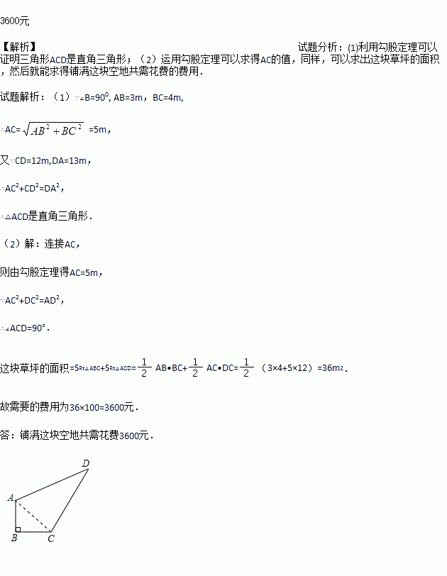如图,某住宅小区在施工过程中留下了一块空地(图中的四边形ABCD),经测量,在四边形ABCD中,AB=3m,BC=4m,CD=12m,DA=13m,∠B=900.小区为美化环境,欲在空地上铺草坪,已知草坪每平方米100元,试问铺满这块空地共需花费多少元?