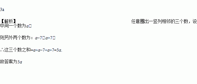如图所示的日历中,任意圈出一竖列相邻的三个数,设中间的一个数为a,则这三个数之和为________(用含a的代数式表示)。