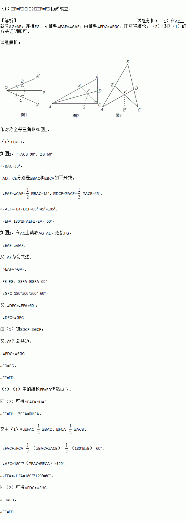 (1)如图②,在△ABC中,∠ACB是直角,∠B=60°,AD、CE分别是∠BAC、∠BCA的平分线,AD、CE相交于点F.请你判断并写出FE与FD之间的数量关系;