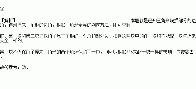 如图所示,某同学把一块三角形的玻璃打碎成了三块,现在要到玻璃店去配一块完全一样的玻璃,那么最省事的办法是带____去玻璃店.