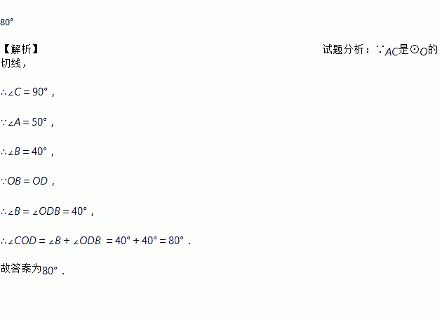 如图,AC是⊙O的切线,切点为C,BC是⊙O的直径,AB交⊙O于点D,连接OD,若∠A=50°,则∠COD的度数为_____.