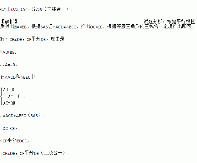 如图,点C在线段AB上,AD∥EB,AC=BE,AD=BC,CF平分∠DCE.试探索CF与DE的位置关系,并说明理由.