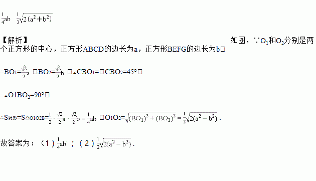 如图,边长为a的正方形ABCD和边长为b的正方形BEFG排放在一起,O1和O2分别是两个正方形的中心,则阴影部分的面积为__,线段O1O2的长为__.