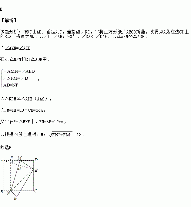 如图,将边长为12cm的正方形ABCD折叠,使得点A落在CD边上的点E处,折痕为MN.若CE的长为7cm,则MN的长为( )