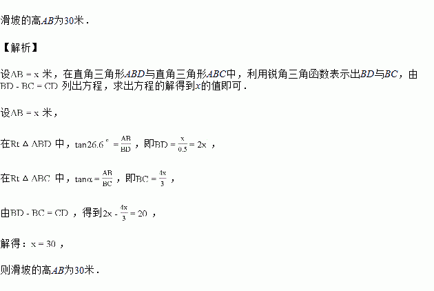 ,在与滑沙坡底C距离20米的D处,测得坡顶A的仰角为26.6°,且点D、C、B在同一直线上,求滑坡的高AB.(结果取整数:参考数据:sin26.6°=0.45,cos26.6°=0.89,tan26.6°=0.50).