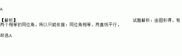 A 【解析】试题解析:由图形得,有两个相等的同位角,所以只能依据:同位角相等,两直线平行, 故选A