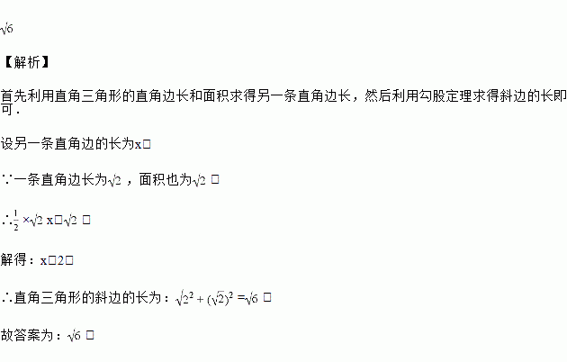 一个直角三角形的一条直角边长为,面积也为,则该直角三角形的斜边长为_____.