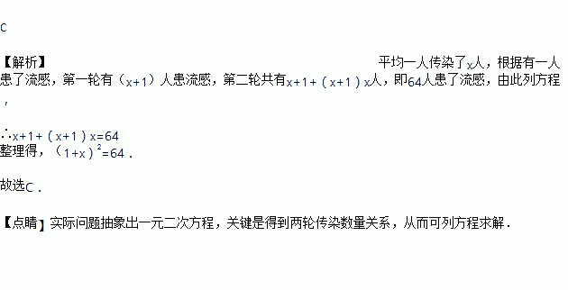 有一人患了流感,经过两轮传染后共有64人患了流感.设每轮传染中平均一个人传染了个人,列出的方程是( )