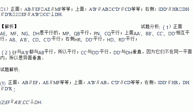 (1)请从正面,上面,右侧三个不同方向上各找出一组平行线段,并用字母表示出来;