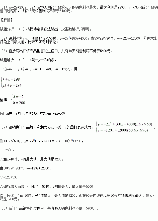 ①该产品90天内日销售量(m件)与时间(第x天)满足一次函数关系,部分数据如下表: