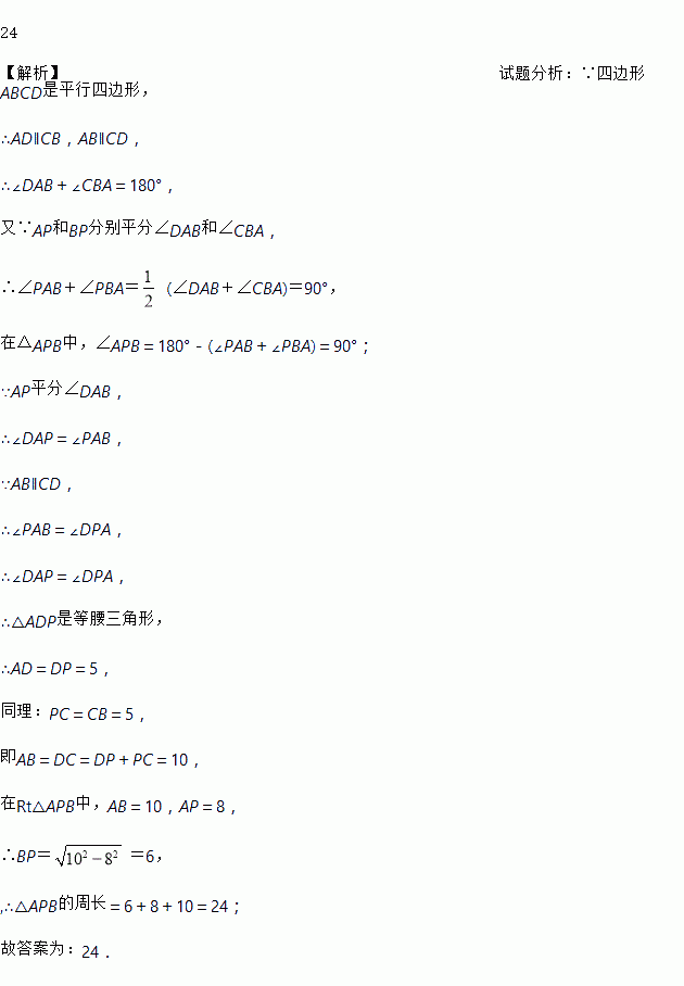 如图,在?ABCD中,P是CD边上一点,且AP和BP分别平分∠DAB和∠CBA,若AD=5,AP=8,则△APB的周长是_______.