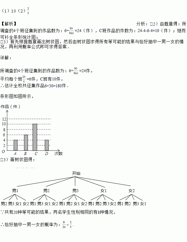 (2)如果全校征集的作品中有5件获得一等奖,其中有3名作者是男生,2名作者是女生,现要在获得一等奖的作者中选取两人参加表彰座谈会,请你用列表或树状图的方法,求恰好选取的两名学生性别相同的概率.