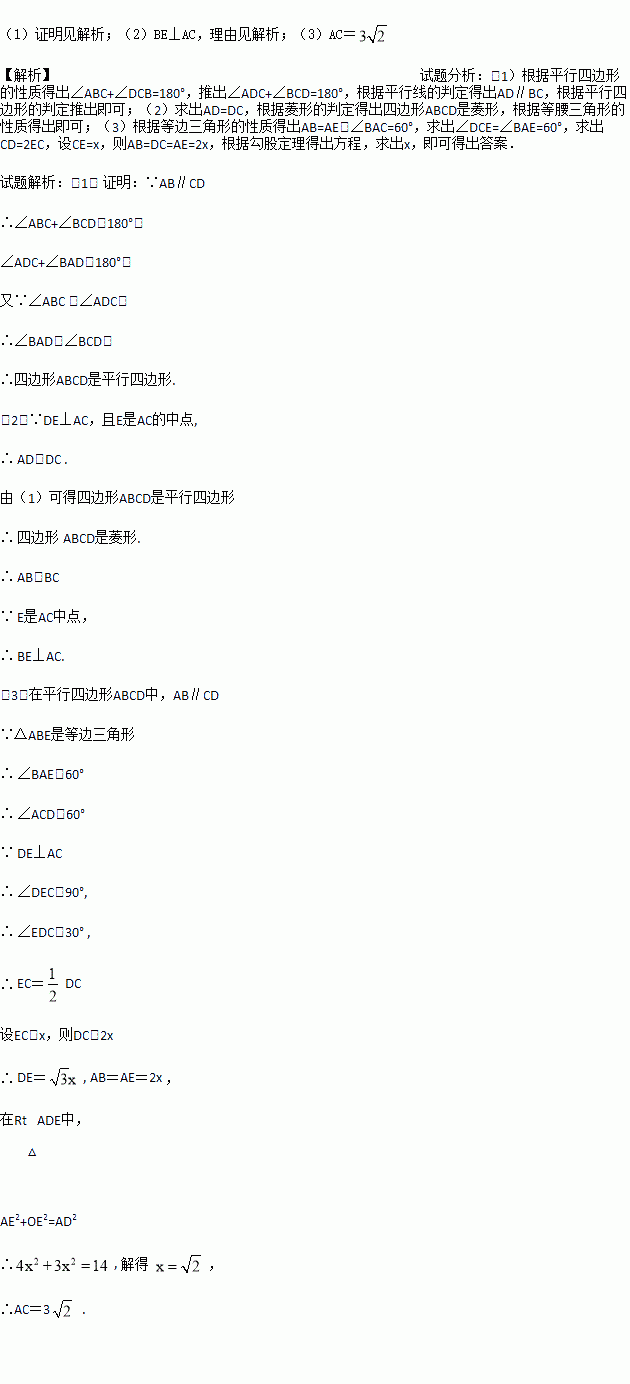 如图,在四边形ABCD中,AB//CD,∠ABC=∠ADC,DE垂直于对角线AC,垂足是E,连接BE .