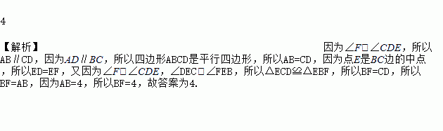 如图,在四边形ABCD中,AD∥BC,点E是BC边的中点,连接DE并延长,交AB的延长线于F点.已知AB=4,∠F=∠CDE,则BF的长为________.