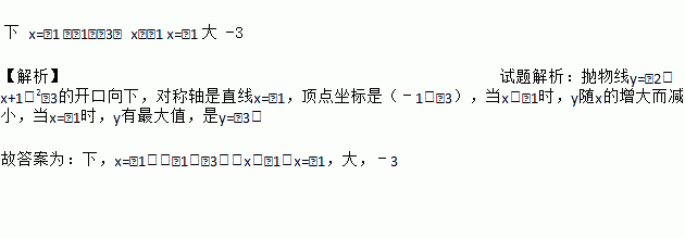 下 x=﹣1 (﹣1,﹣3) x>﹣1 x=﹣1 大 -3 【解析】试题解析:抛物线y=﹣2(x+1)2﹣3的开口向下,对称轴是直线x=﹣1,顶点坐标是(﹣1,﹣3),当x>﹣1时,y随x的增大而减小,当x=﹣1时,y有最大值,是y=﹣3, 故答案为:下,x=﹣1,(﹣1,﹣3),x>﹣1,x=﹣1,大,﹣3