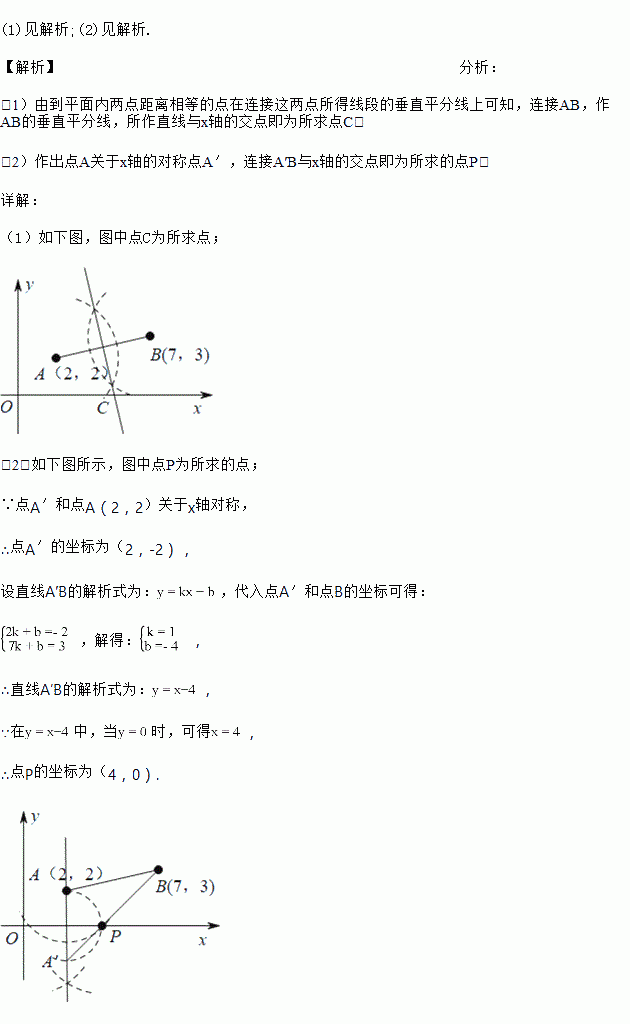 A,B两所学校在一条东西走向公路的同旁,以公路所在直线为x轴建立如图所示的平面直角坐标系,且点A的坐标是(2,2),点B的坐标是(7, 3),根据下列要求作图(保留作图痕迹,不用写作法).