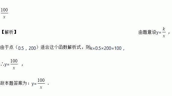 【解析】由题意设y=, 由于点(0.5,200)适合这个函数解析式,则k=0.5×200=100, ∴y= , 故本题答案为:y=.