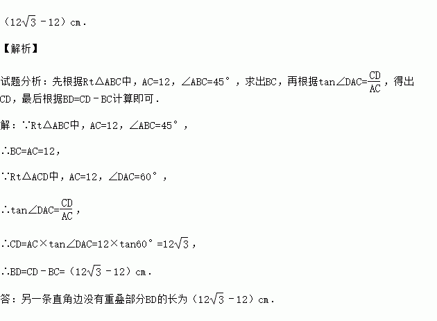 (2013•朝阳)如图1,在综合实践活动中,同学们制作了两块直角三角形硬纸板,一块含有30°角,一块含有45°角,并且有一条直角边是相等的.现将含45°角的直角三角形硬纸板重叠放在含30°角的直角三角形硬纸板上,让它们的直角完全重合.如图2,若相等的直角边AC长为12cm,求另一条直角边没有重叠部分BD的长(结果用根号表示).