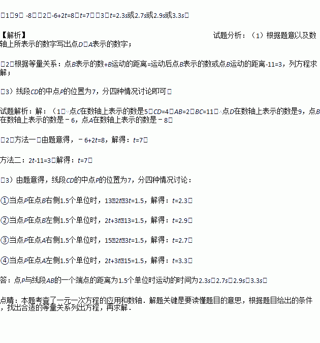 £¨3£©ÈôÏß¶ÎAB¡¢CDͬʱ´ÓÔÀ´µÄλÖóö·¢£¬Ïß¶ÎABÒÔÿÃë2¸öµ¥Î»µÄËÙ¶ÈÏòÓÒÔÈËÙÔ˶¯£¬Ïß¶ÎCDÒÔÿÃë3¸öµ¥Î»µÄËÙ¶ÈÏò×óÔÈËÙÔ˶¯£¬°ÑÏß¶ÎCDµÄÖеã¼Ç×÷P£¬ÇëÖ±½Óд³ö£¬µãPÓëÏß¶ÎABµÄÒ»¸ö¶ËµãµÄ¾àÀëΪ1.5¸öµ¥Î»Ê±Ô˶¯µÄʱ¼ä£®