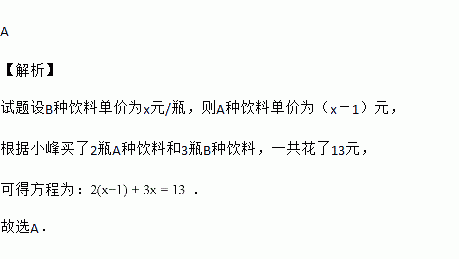 A种饮料比B种饮料单价少1元,小峰买了2瓶A种饮料和3瓶B种饮料,一共花了13元,如果设A种饮料单价为x元/瓶,那么下面所列方程正确的是( )