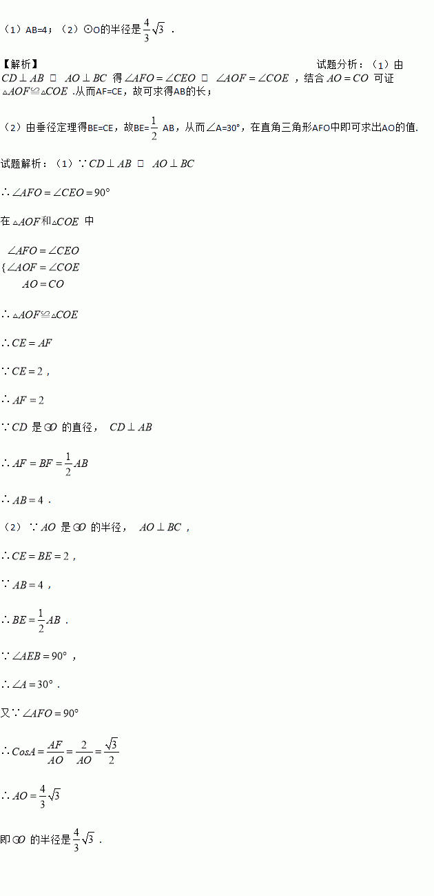 (1)AB=4;(2)⊙O的半径是. 【解析】试题分析:(1)由, 得, ,结合可证.从而AF=CE,故可求得AB的长; (2)由垂径定理得BE=CE,故BE=AB,从而∠A=30°,在直角三角形AFO中即可求出AO的值. 试题解析:(1)∵, ∴ 在中 ∴ ∴ ∵, ∴ ∵是的直径, ∴ ∴. (2) ∵是的半径, ,...
