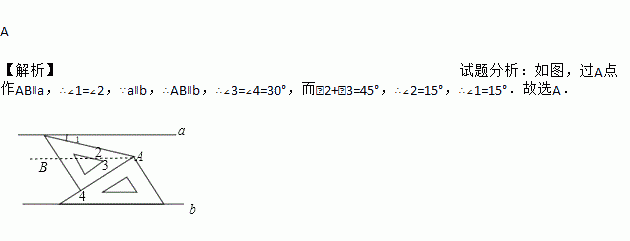 将一副三角板和一张对边平行的纸条按如图摆放,两个三角板的一直角边重合,含30°角的直角三角板的斜边与纸条一边重合,含45°角的三角板的一个顶点在纸条的另一边上,则∠1的度数是( )