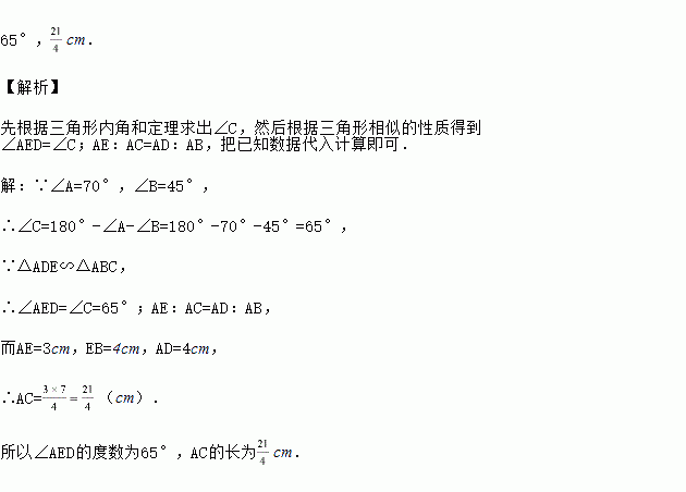 如图,已知△ADE∽△ABC,∠A=70°,∠B=45°,AE=3cm,EB=4cm,AD=4cm,