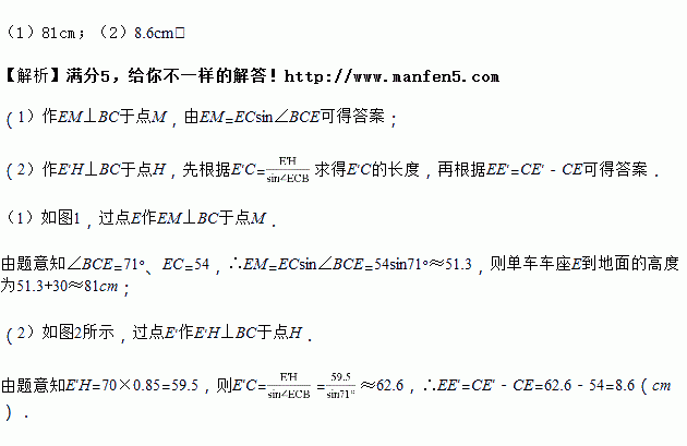 (2)根据经验,当车座E到CB的距离调整至等于人体胯高(腿长)的0.85时,坐骑比较舒适.小明的胯高为70cm,现将车座E调整至座椅舒适高度位置E′,求EE′的长.(结果精确到0.1cm)