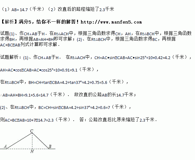 如图,从A地到B地的公路需要经过C地,图中AC=10千米,∠CAB=25°,∠CBA=37°。因城市规划的需要,将在A,B两地之间修建一条笔直的公路。