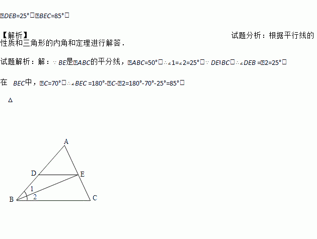 如图,已知DE∥BC,BE是∠ABC的平分线,∠C=70°,∠ABC=50°.求∠DEB和∠BEC的度数.