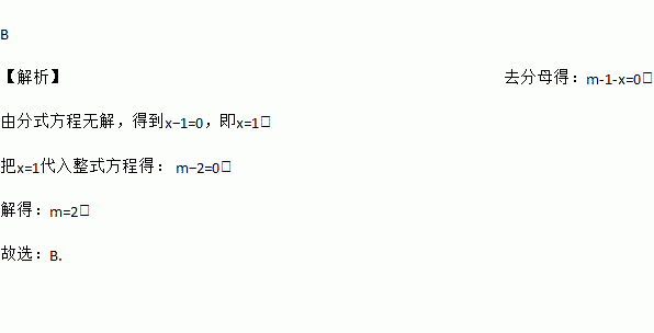B 【解析】去分母得:m-1-x=0, 由分式方程无解,得到x?1=0,即x=1, 把x=1代入整式方程得: m?2=0, 解得:m=2, 故选:B.