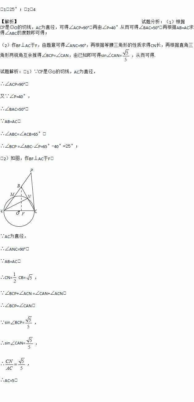 Èçͼ£¬ÔÚ¡÷ABCÖУ¬AB=AC£¬ÒÔACΪֱ¾¶µÄ¡ÑO·Ö±ð½»AB¡¢BCÓÚµãM¡¢N£¬Ö±ÏßCPÊÇ¡ÑOµÄÇÐÏߣ¬ÇÒµãPÔÚABµÄÑÓ³¤ÏßÉÏ£®