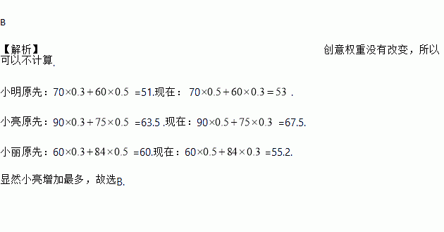 现在要计算3人的加权平均分,如果将采访写作、计算机和创意设计这三项的权比由3∶5∶2变成5∶3∶2,成绩变化情况是( )